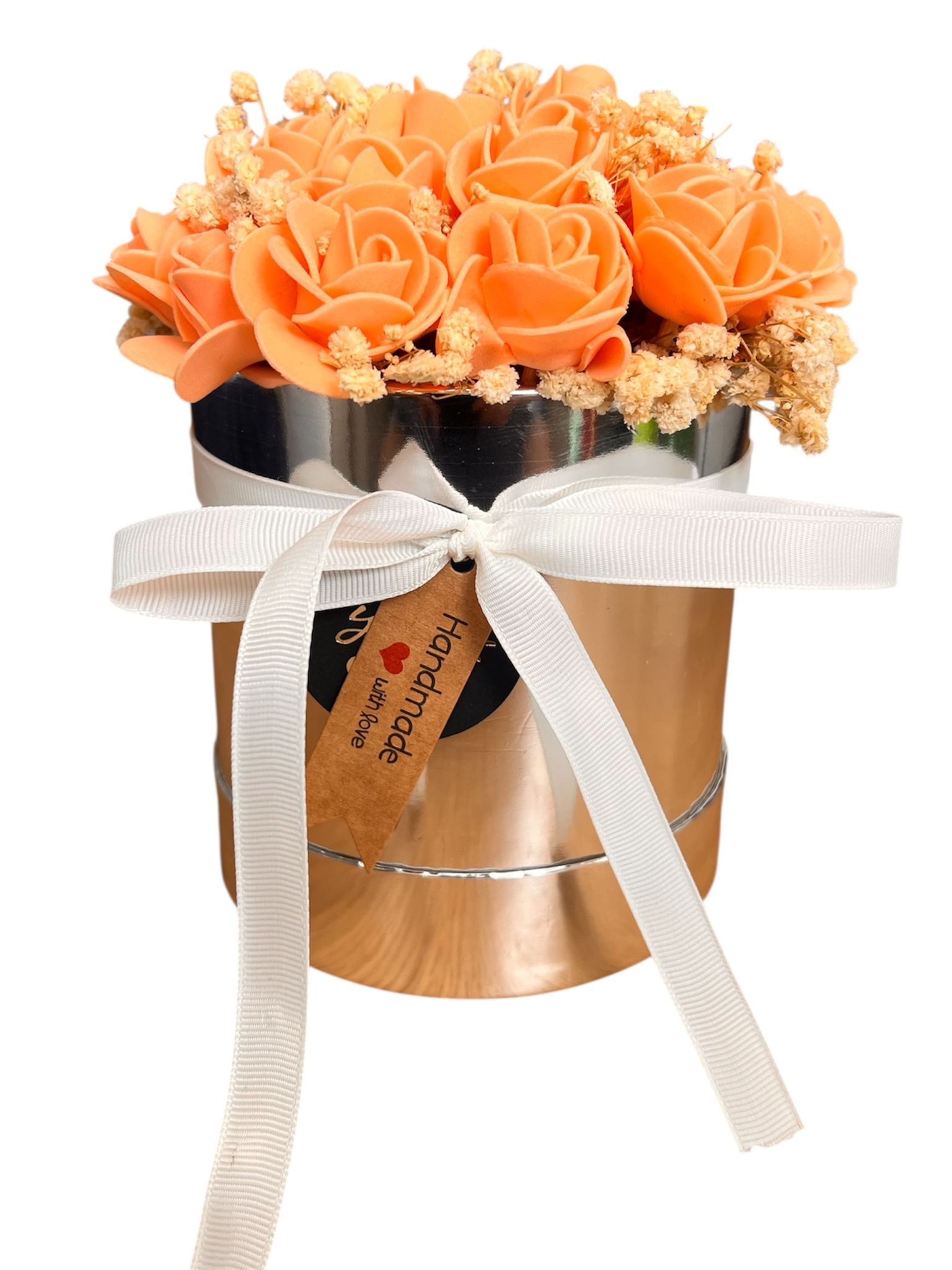 Elegancki boks kwiatowy wykonany z delikatnych kwiatów z pianki, ozdobiony subtelną gipsówką. Idealny jako trwały prezent, który nie więdnie – świetnie sprawdzi się na każdą okazję: urodziny, rocznicę, Dzień Matki czy jako dekoracja wnętrza. Starannie wykonana kompozycja zachwyca realistycznym wyglądem i dbałością o każdy detal. Całość zapakowana w estetyczne pudełko, gotowe do wręczenia jako upominek